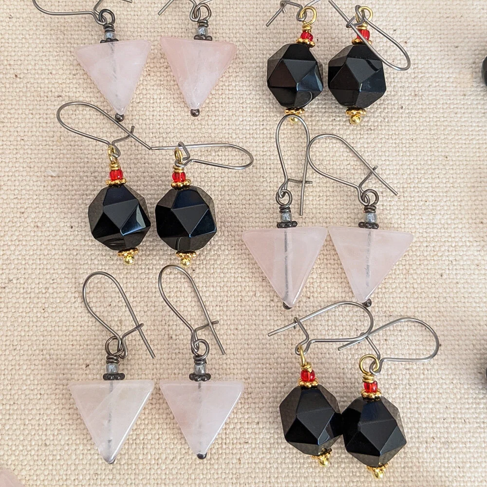 As always with natural stones, the rose quartz earrings will vary naturally. They are all light pink with some amount of white marbling, and I will do my best to match stones. The tips of the triangles also vary in sharpness, so the bead of gunmetal at the bottom of the earrings will sit differently on every pair.