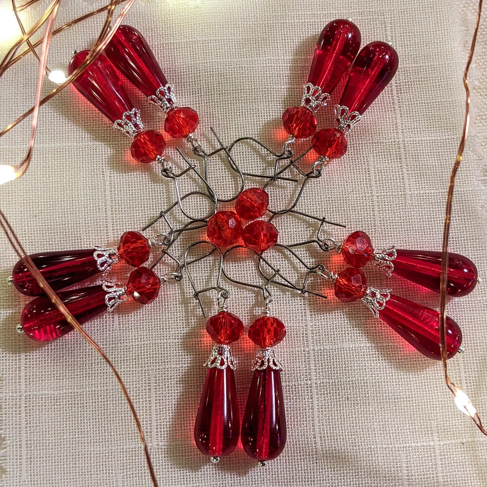 Sparkly and shiny red drops are set off by lacy silver collars. The hooks are hypoallergenic, stainless steel.