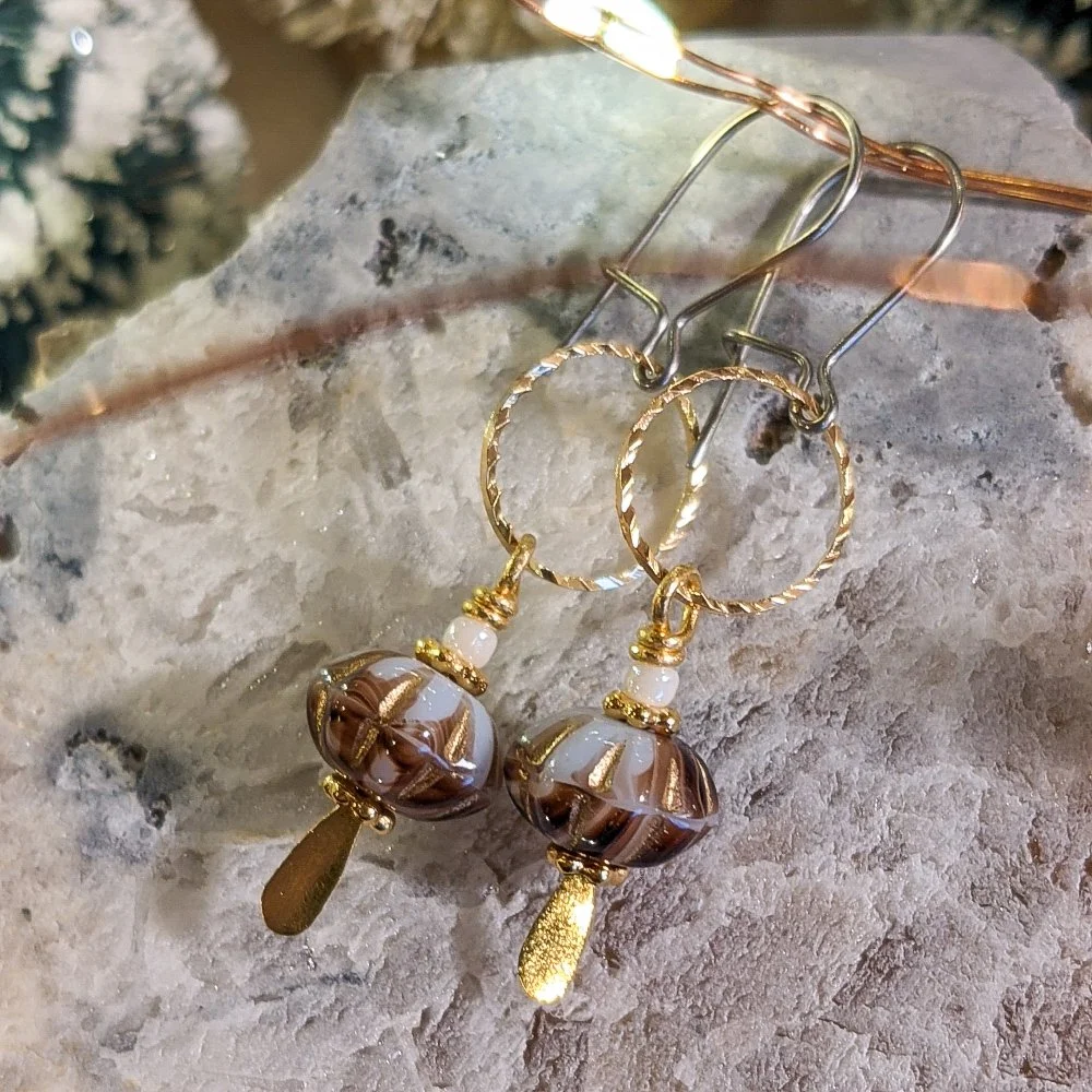 Warm browns swirl with creamy whites, like chocolate mixing with hot milk (of your choice) to make a comforting, sweet cup of hot chocolate. Gold glints from top to bottom in the form of textured rings, bubble bead caps, and flashy paddle drops. Little beads of white top the hot chocolate beads, like marshmallows or whipped cream (with an iridescent coating). Wear these earrings while you’re sitting in front of flickering firelight, or curled up, surrounded by fairy lights, drinking a cup of hot cocoa — or, at least, imagine yourself there!
